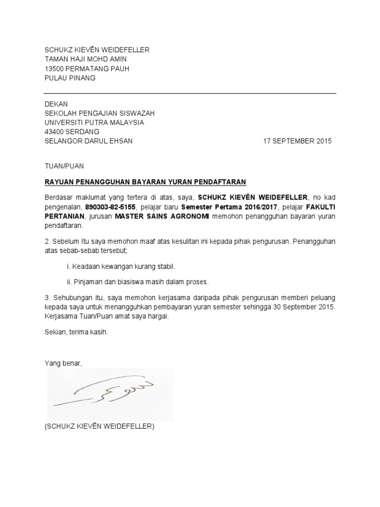 Contoh Surat Rasmi Rayuan Penangguhan Bayaran Yuran Pendaftaran Universiti Pdf